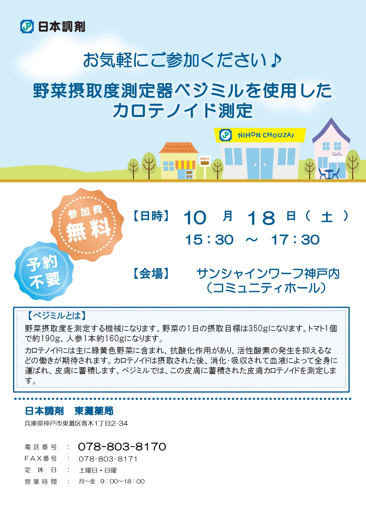 野菜摂取度測定器(ベジミル)でカロテノイド測定♪ 日 時:10月18日(土)15:30~17:30…