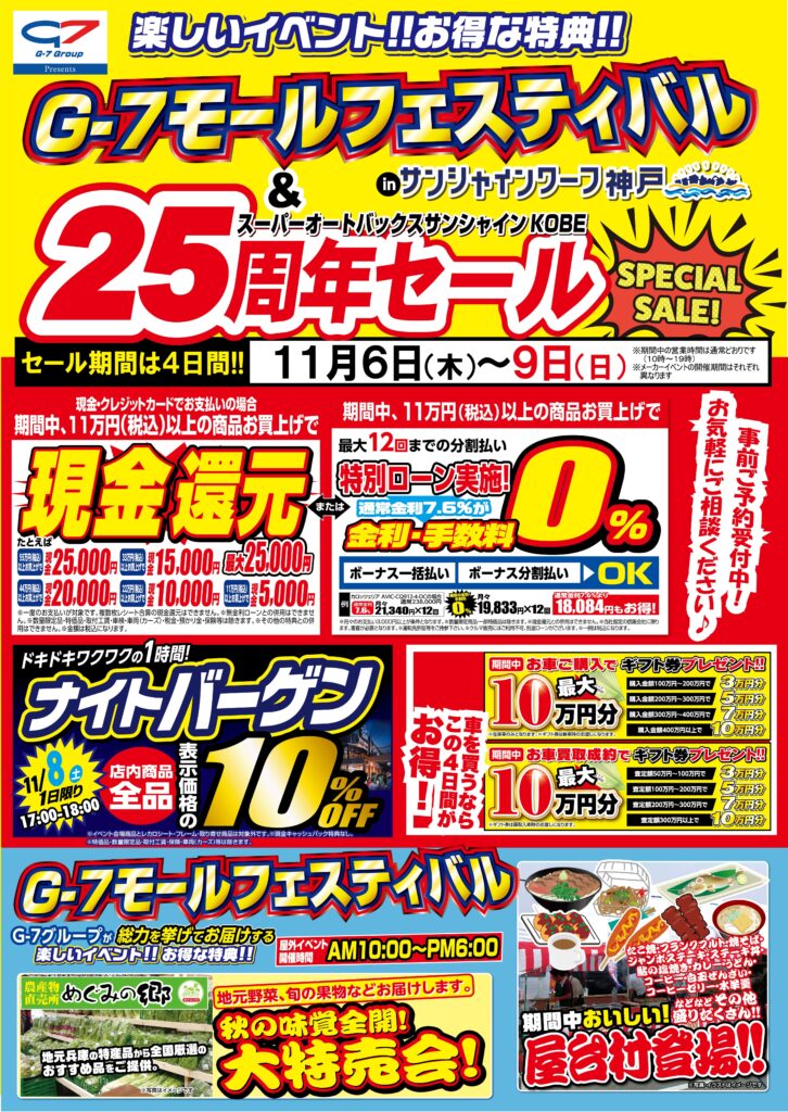 🎵G-7モールフェスティバル11月6日(木)~9日(日)までの4日間 11月6日(木) スーパーオートバックスサンシャインKOBE店 オープン25周年セール開催 セール期間:11月6日(木)~9日(日)4日間 10:00~19:00迄 ※屋外イベントは10:00~18:00迄 サンシャインガーデンにて開催中 屋台村も登場! お食事も楽しめます。